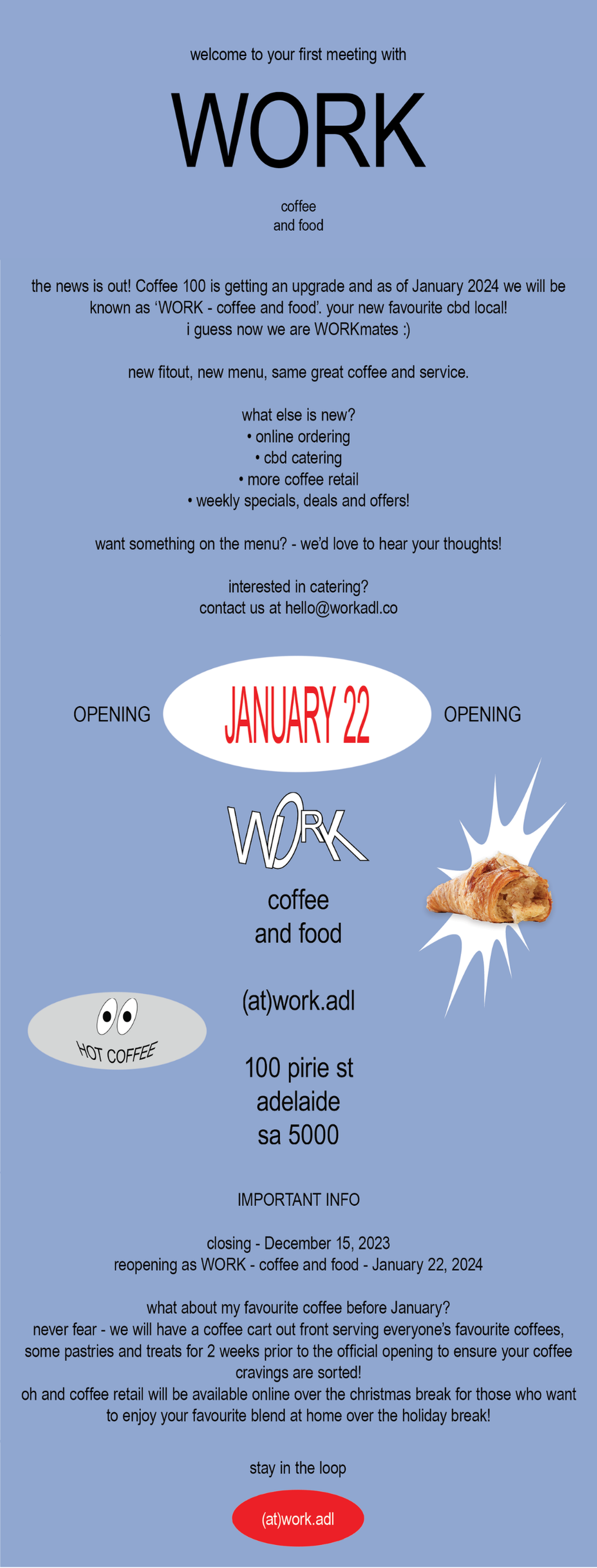 WORK is a new café in Adelaide's CBD that needed to make an immediate visual impact in a competitive market. From day one, the branding had to work hard... Catching foot traffic, building social presence, and announcing their arrival with confidence. The challenge was creating cohesive graphics across physical and digital spaces that felt polished but approachable, modern but not pretentious.